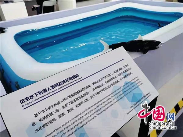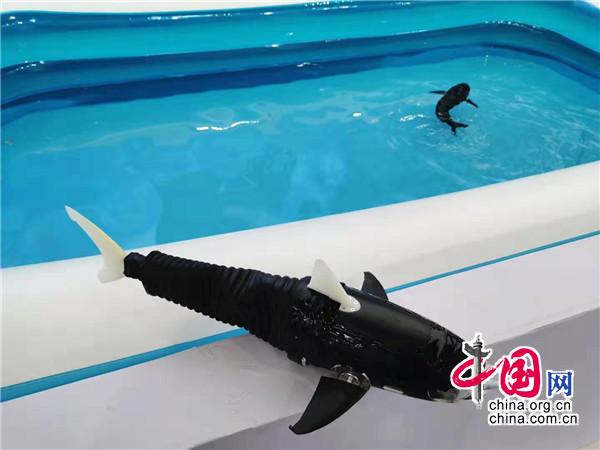 论坛展厅内的水下仿生机器鱼可应用于水下探测、搜索、救援等。游弋自如的仿生鱼造型逼真