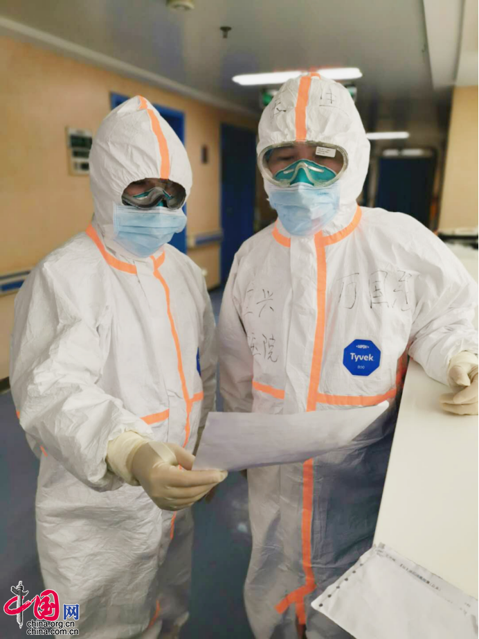 刚开始的几天,由于每天收治的病人比较多,医护人员们主动加班加点,自觉延长工作时间。万国强上的第一个夜班,是从晚上5点上到翌日早上9点。整整16个小时,他不能喝水、吃东西,也不能上厕所,更不能睡觉休息。“我还好的,除了戴2层口罩,时间长了有点胸闷,其他忍忍就过去了。”在和妻子蒋利伟的通话中,对于刚刚经历的异常难熬的16个小时,万国强说得轻描淡写。他说,隔离衣、防护服、双层口罩、防护面罩……整套装备穿脱一次,大约需要40分钟,而且脱下来就全部报废了,现在防护物资那么稀缺,他和同伴们只能克服各种生理需求,尽量减少进出病区的次数。一般进了隔离病区,中间就不出来了。为了减轻膀胱的压力,进病区前1个小时就不能喝水了。有的同事用上了“尿不湿”,但他暂时还没用,因为实在不习惯。