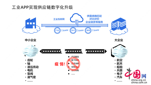 为认真贯彻落实习近平总书记的重要指示精神,帮助中小企业用工业互联网、工业APP等方式抗击疫情、走出困境,在工信部信息发展司、工信部中小企业局、国资委相关司局的支持下,中国工业互联网研究院联合北京市经信局、浙江省经信厅、广东省工信厅、重庆市经信委、河北省发改委等政府部门,中航工业、中航发、航天科技、中国船舶、中国兵器、中国电科、索为、中国能源工程公司、泛华集团、重庆机电等企业,浦发银行总行、中国互联网基金等投融资机构以及广东省中小企业发展促进会、中国机械工程学会、中国工业技术软件化产业联盟等机构,于2月22日召开网络座谈会,并发起《百万工业APP抗疫助能——大企业帮扶中小企业复工复产复融》行动,利用工业互联网平台,采用工业APP创新制造业生产范式、供应链模式、融资方式等方面,推动大中小企业协同发力、融通发展,联合互救、共克时艰。