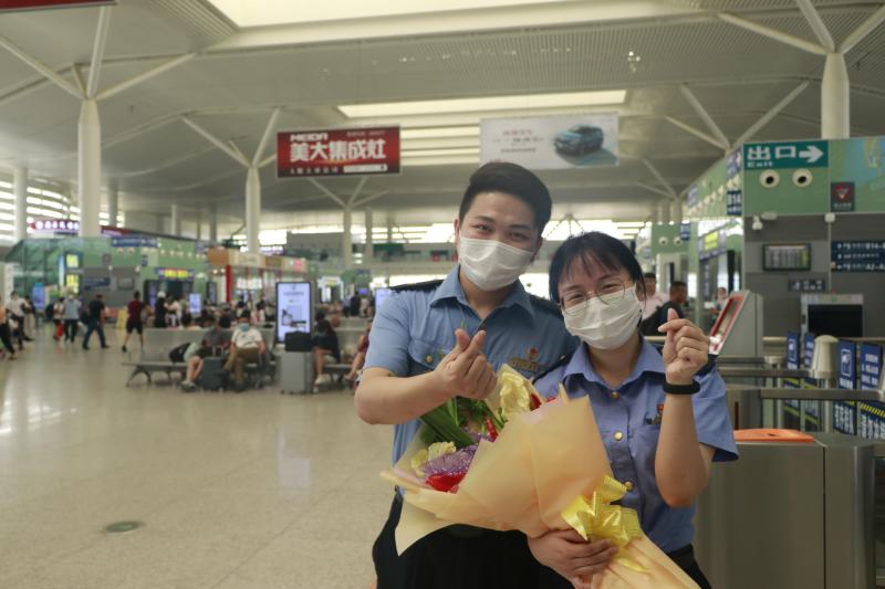 陈雅君负责西站检票口工作,周斌负责站台组织,虽说在一个班组上班,但是因为岗位不同,尽管相距只有不到几百米,上班的时候也难得见上一面。随着国内疫情形势的好转,南昌西站暑运的客流量也逐步攀升,繁忙的工作让这对“高铁夫妻”见面变得更加困难来起来。