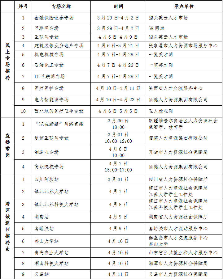 线下活动9场:举办四川阿坝站、湖南站、燕山大学站等9场跨区域巡回招聘会,除本地用人单位外,还将邀请外省市人社部门组织用人单位组团参会招聘。