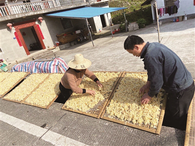 2020年3月,加工厂正式投产后,试生产了2000斤笋干、笋衣,短短时间内就销售过半,零售价每斤可以达到45元至50元。同时,村中还成立了合作社,通过统一收购周边新鲜竹笋加工、真空包装、申请商标、挂网销售,逐渐形成适应市场要求的产、供、销一条龙服务,给村集体带来稳定收入。