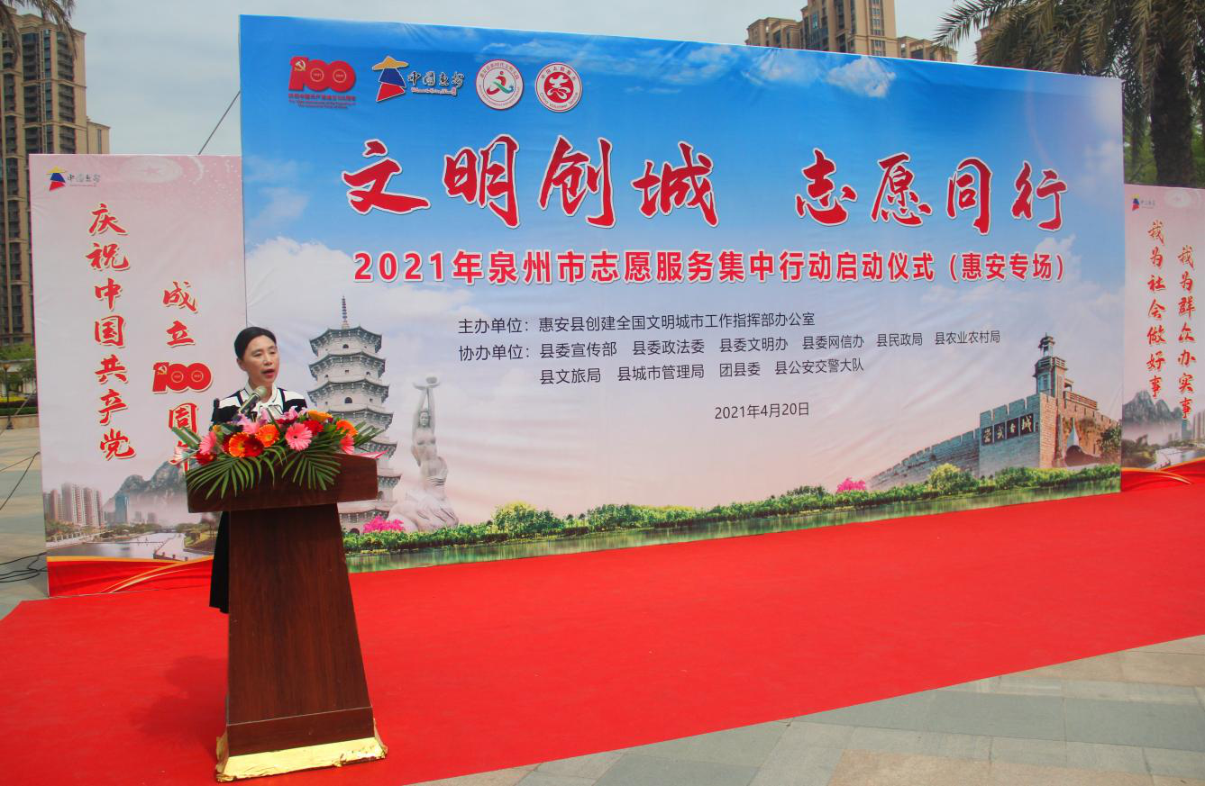 仪式上,惠安县委常委、宣传部部长许贞丽指出,在泉州市创城办的统一部署下,今天全市正式启动“文明创城、志愿同行”主题志愿服务集中行动。许贞丽强调,惠安的志愿者应当首当其冲、勇担重任、踊跃参与,以十大志愿服务行动为载体,结合党史学习教育活动和‘再学习、再调研、再落实’活动的开展,大力弘扬志愿服务精神,集中开展志愿服务行动,努力为社会办好事、为群众办实事。