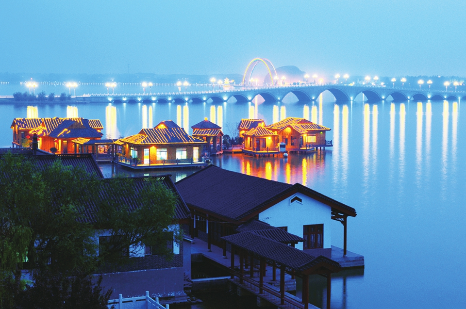 第五,建设景点。景点共10多处,我印象比较深的,一个是湖滨浴场,也叫沙滩浴场,从外面拉来沙子,然后滤沙、砌沙,铺在湖边滩地上,成为夏季大家喜欢的消暑胜地;一个是江北水寨,由栈桥、回廊、亭台轩榭组成,极具江南风格,是休闲娱乐的好地方;还有一个是在湖西岸,依托地域特点建了一个半岛,就是现在水城明珠大剧场的所在地。