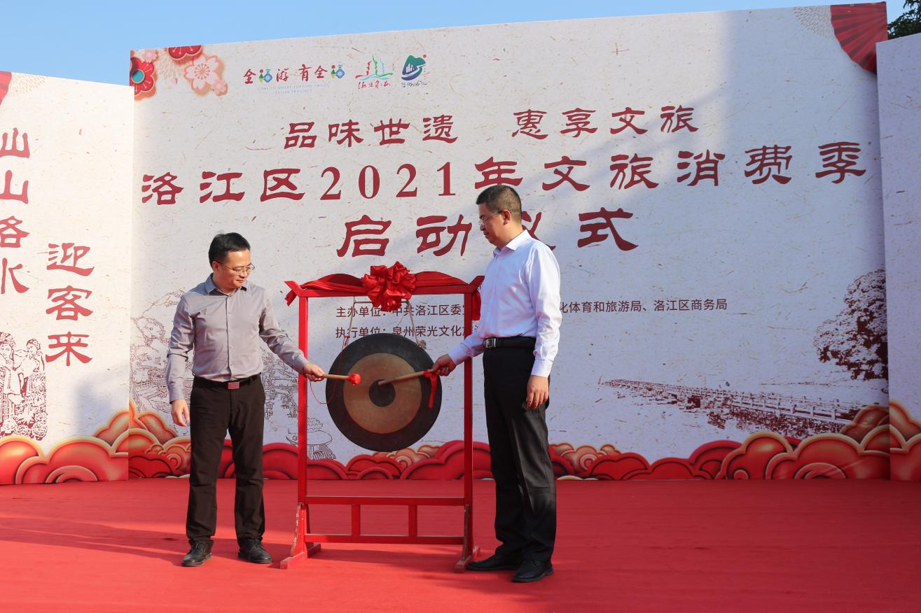▲ 泉州市文旅局党组成员周梁升与洛江区委常委、政法委书记涂德望一起敲锣启动活动。(黄娜玲 摄)