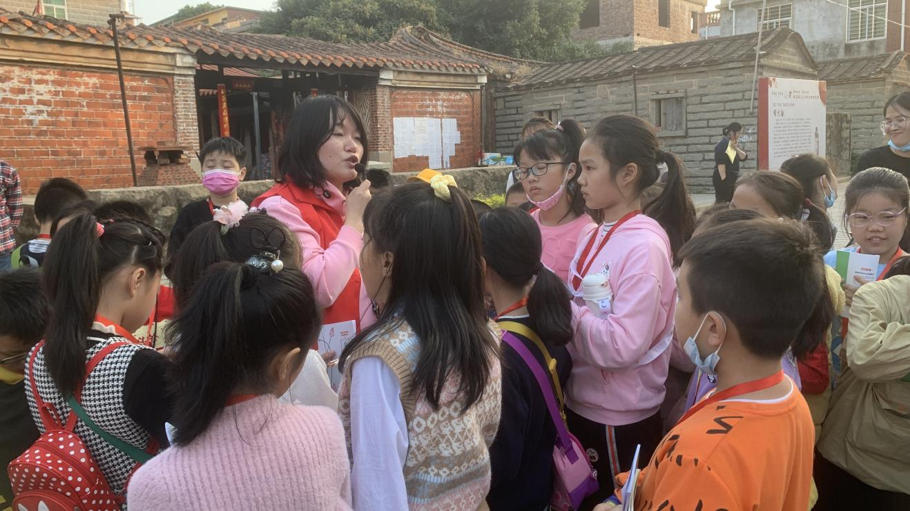▲ 志愿者现场为祖国的花朵们介绍世界文化遗产点之一——洛阳桥,传承世遗文化。(黄娜玲 摄)