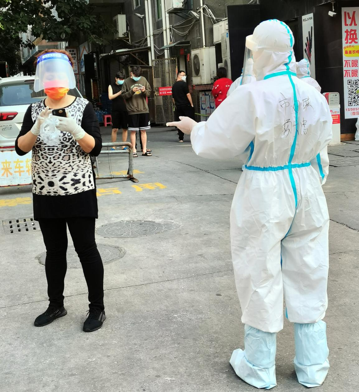 疫情当前,巾帼当先。工作队分三组,每组当值8小时。哪怕是那套防护服穿上湿了又干,又或者从没有干过,哪怕有多不舒服,也没有一个人退缩。工作队共26人,其中有3名队员原为黄码,在两次核酸检测结果为阴后,主动请缨,支援一线;有4名队员为两孩家长;有6名队员年龄在50岁以上,仍与年轻干部一起坚守一线;有15名队员,夫妻双方均在一线,顾不上家中老人与孩子,虽然休息时,会聊聊家长里短,家里的孩子有点不舒服、有点不听话,家里的老人不知道怎么去核酸检测……对小家满满地牵挂,但此刻每个人心里却装着责任区域近1600名住户。