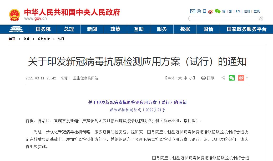 为进一步优化新冠病毒检测策略,根据疫情防控需要,国务院联防联控机制综合组研究决定,推进“抗原筛查、核酸诊断”的监测模式,在核酸检测基础上增加抗原检测作为补充。