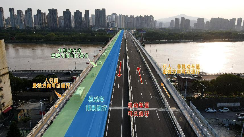 机动车往新桥通行,新桥布设4条机动车道,进城方向为1条机动车道和1条机动车应急停车道,出城方向为2条机动车道(上桥后扩为3条机动车道)。旧桥限制机动车通行。