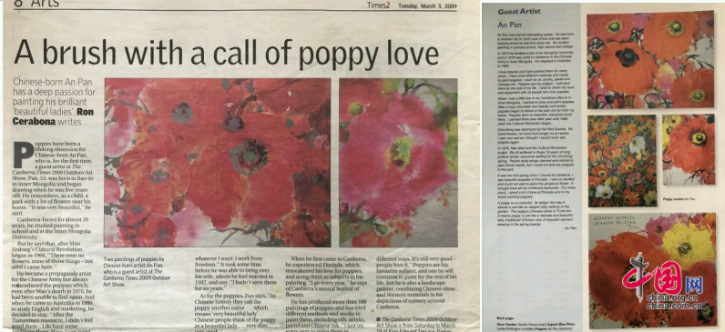 2003年,潘鞍的油画作品《虞美人》在澳洲掀起了一阵新的狂热。因为深受中国文化的沁润,潘鞍的《虞美人》结合了中国画泼墨的画法以及西方绘画中大胆的用色,又以书法的形式加入了唐诗宋词的意境——“人比黄花瘦、年年花相似、岁岁人不同”,这个系列的作品深受到西方世界的追捧和喜爱,当地人称他为“poppy men”,意思是画罂粟的男人,足以看出西方世界对中国传统艺术的欣赏程度。潘鞍,再次成为“中国艺术”的象征。