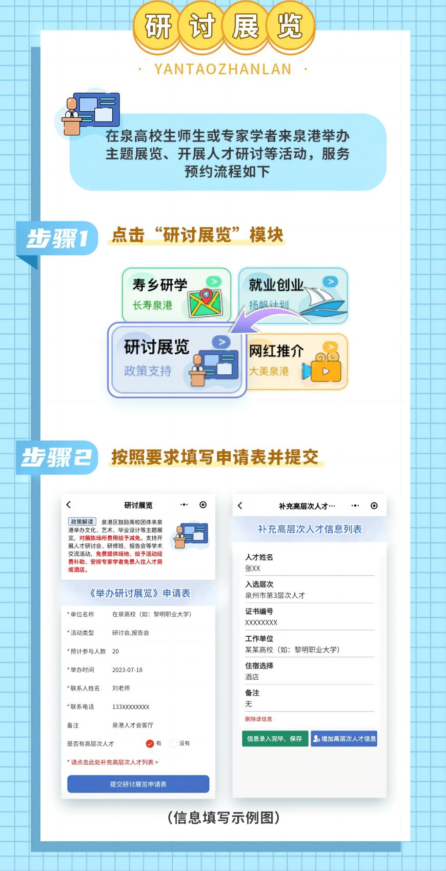 鼓励高校团体来泉港举办文化、艺术、毕业设计等主题展览,对展陈场所费用给予减免。支持开展人才研讨会、研修班、报告会等学术交流活动,免费提供场地、给予活动经费补助、安排专家学者免费入住人才房或酒店。