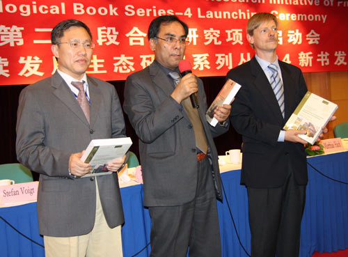 联合国教科文组织北京办事处主任兼代表代办Min Bista先生(中)和德国驻华使馆科技参赞Matthias Hack先生(右)及中国科技部官员邢继俊(左)共同发布新书。 |