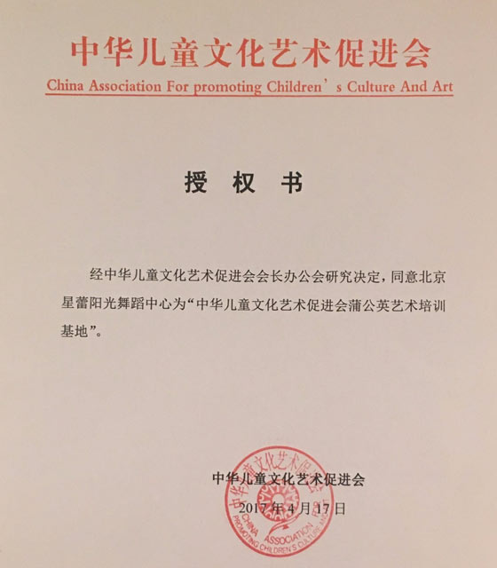 “中华儿童文化艺术促进会蒲公英艺术培训基地”授权书。