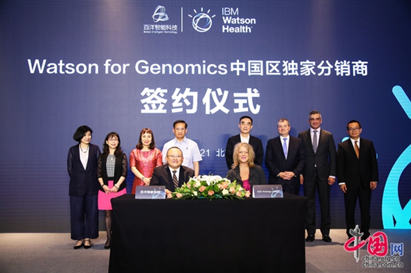 中国网6月22日讯 (记者何珊) 6月21日,百洋医药集团旗下百洋智能科技与IBM Watson Health公司在北京联合发布,百洋智能科技成为Watson for Genomics(Watson基因解决方案)在中国地区的独家分销商,双方将共同推进肿瘤基因组分析的落地应用,为病理学家和肿瘤医生提供基于致癌基因突变的精准治疗方案建议。