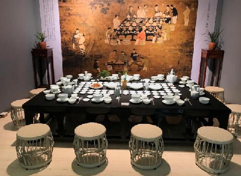 仿古瓷展区展出了包括宋景德镇窑青白釉弦纹瓶、元青花鱼藻纹大盘、明成化斗彩龙纹盘等200余件仿古精品,其中曾拍出2.3亿天价的元青花鬼谷子下山大罐和2.8亿港币的明成化斗彩鸡缸杯等高仿制品,维妙维肖,令人叹为观止。景德镇的高仿瓷生产至少可以追溯到明代早期,如永乐御窑生产的仿龙泉青瓷,最典型的当属明成化、清康雍乾三代大量的仿宋官窑、哥窑和龙泉窑瓷器。此次展览主要集中的是元明清三代的高仿瓷,从景德镇有影响力的仿古瓷生产厂家遴选而来。记者还注意到,展区内依据宋徽宗赵佶《文会图》画境布设的仿古青白瓷茶会场景别具一格,充分显示了中华瓷茶文化相通相融的极致风姿。