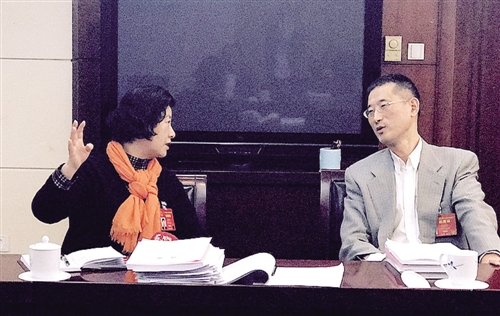 3月8日上午,上海代表团小组会上,贾伟平代表(左)和芮跃华代表讨论共享单车这种新型业态的发展前景问题。佘惠敏摄