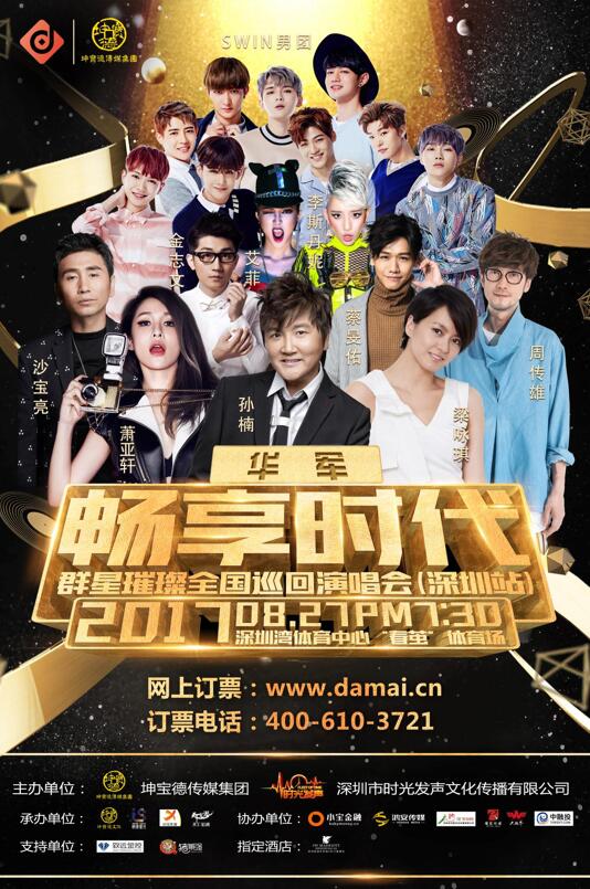 27日深圳湾体育场的夏夜,还有更多巨星强势来袭:孙楠、梁咏琪、沙宝亮、周传雄、金志文、蔡旻佑、李斯丹妮、艾菲、SWIN男团等带你们燃烧起热情的火焰,让这个夏夜更燃、更爆!现场更有神秘嘉宾空降现场,想知道是谁?那就让我们共同期待8月27日“畅享时代·群星璀璨全国巡回演唱会深圳站”用你们的声浪迎接这一夜的到来!