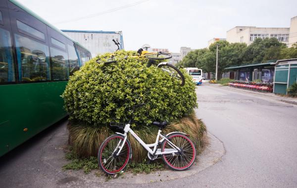 8月10日,杭州某处的共享单车被随意停靠在路边,甚至有的被扔上了一米多高的灌木丛。