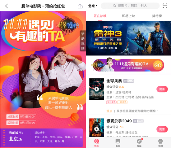 11月1日-11月5日开放预约渠道,11月6日-11月11日正式对外售票,预约期间淘票票还将每天发放1111个价值11.11元的脱单红包,所有场次皆在双11当天19:00正式开场,在零点开抢前与TA来场电影,说不定还能抓住购物节的尾巴遇到帮你“清空购物车”的对象。