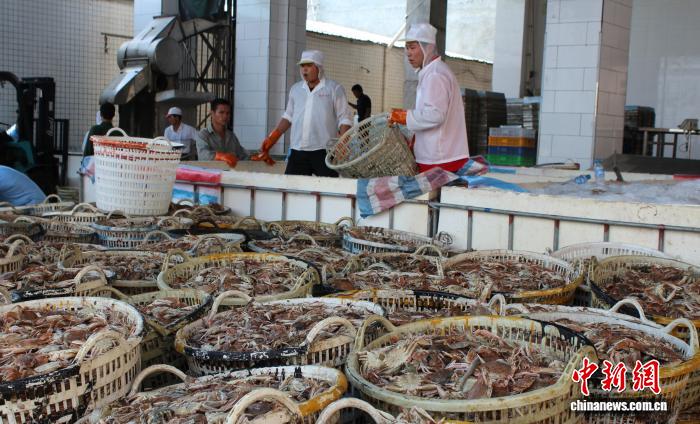图为捕获的梭子蟹被运往工厂加工。福建东山海源水产有限公司 供图