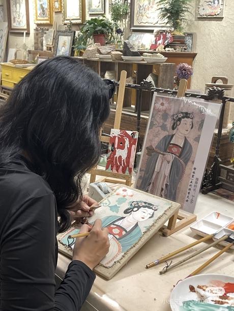 在朱俊峰开的非遗体验馆,顾客在临摹敦煌壁画的图片。受访者供图